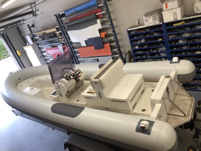 De Hypalon-laag bovenop de tube was versleten door weersinvloeden. We hebben het bovenste deel van de tube gestript en een nieuwe laag Orca Hypalon aangebracht. Afgewerkt met antislip patches en de vervanging van de navigatielichten.